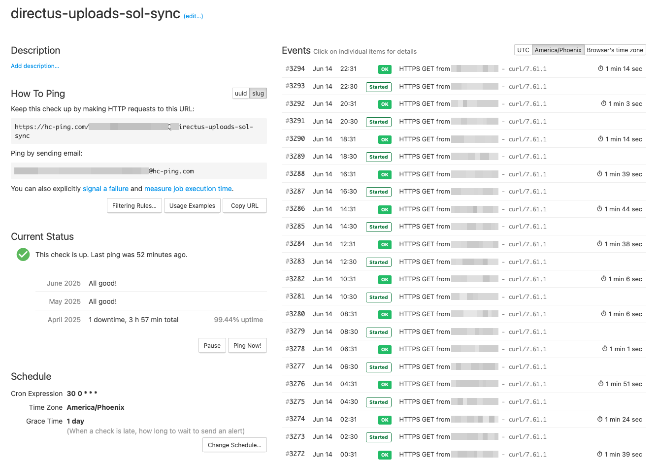 Eventually, we had automations that interacted with other unreliable remote systems so the cronjobs would fail more frequently with different errors. To better monitor these jobs I rely on an amazing tool Healthchecks.io with a generous free tier. Healthchecks is a heartbeat style monitoring service where you can add generate unique ping URLs for each job.