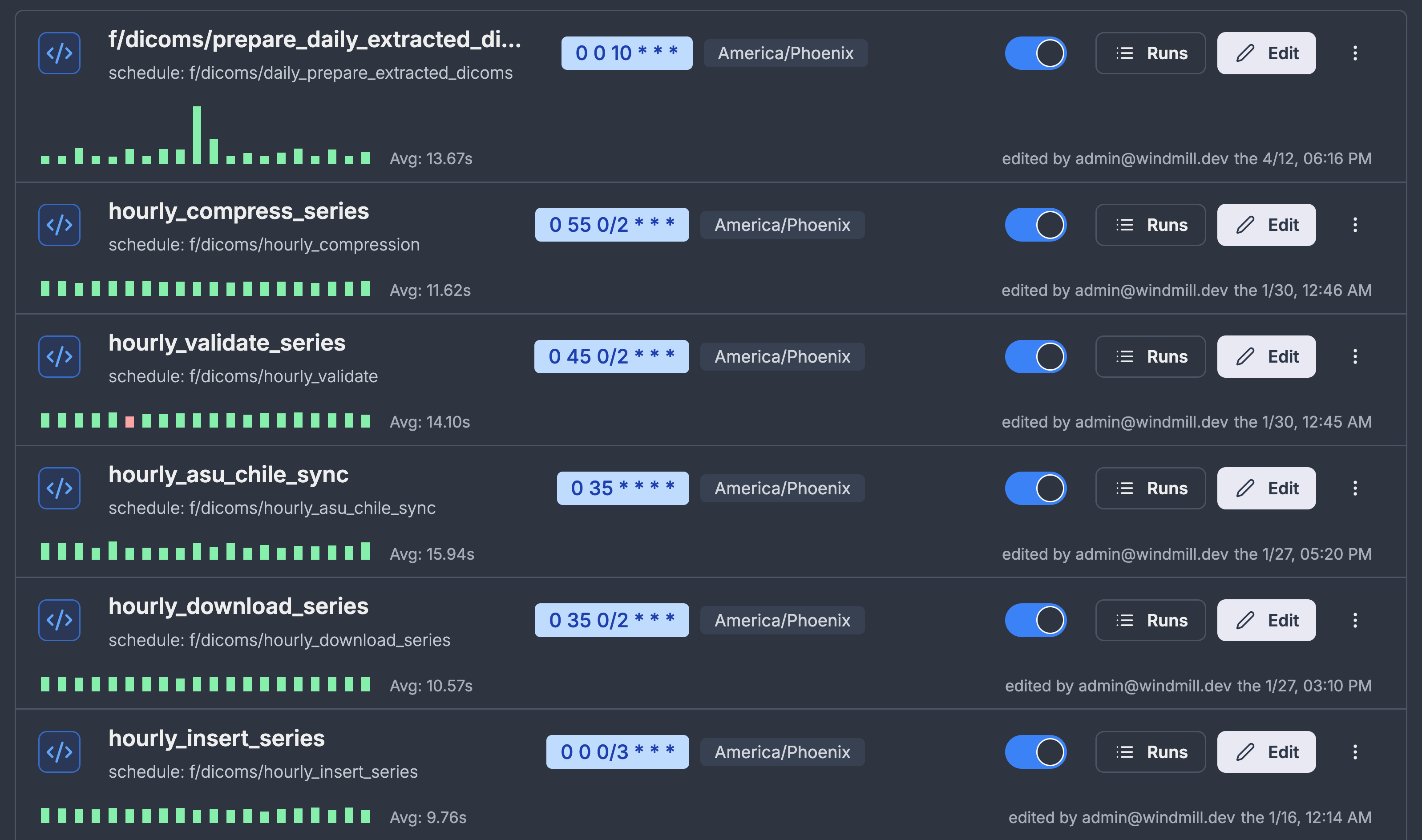 The first job that kicks everything off is the automation that checks the hospital's PACS for any new data from THLHP participants. The job identifies THLHP participants by using a regular expression. If a new patient is detected then their information is added to our central database which kicks off downstream jobs to download any data relating to them. Occasionally, there are circumstances when we want to download data for participant_ids that do not match our regex, for example when there is a typo or when the machine is being calibrated. For these circumstances the automation accepts custom custom_patient_ids as a list which can be populated through windmill GUI.
