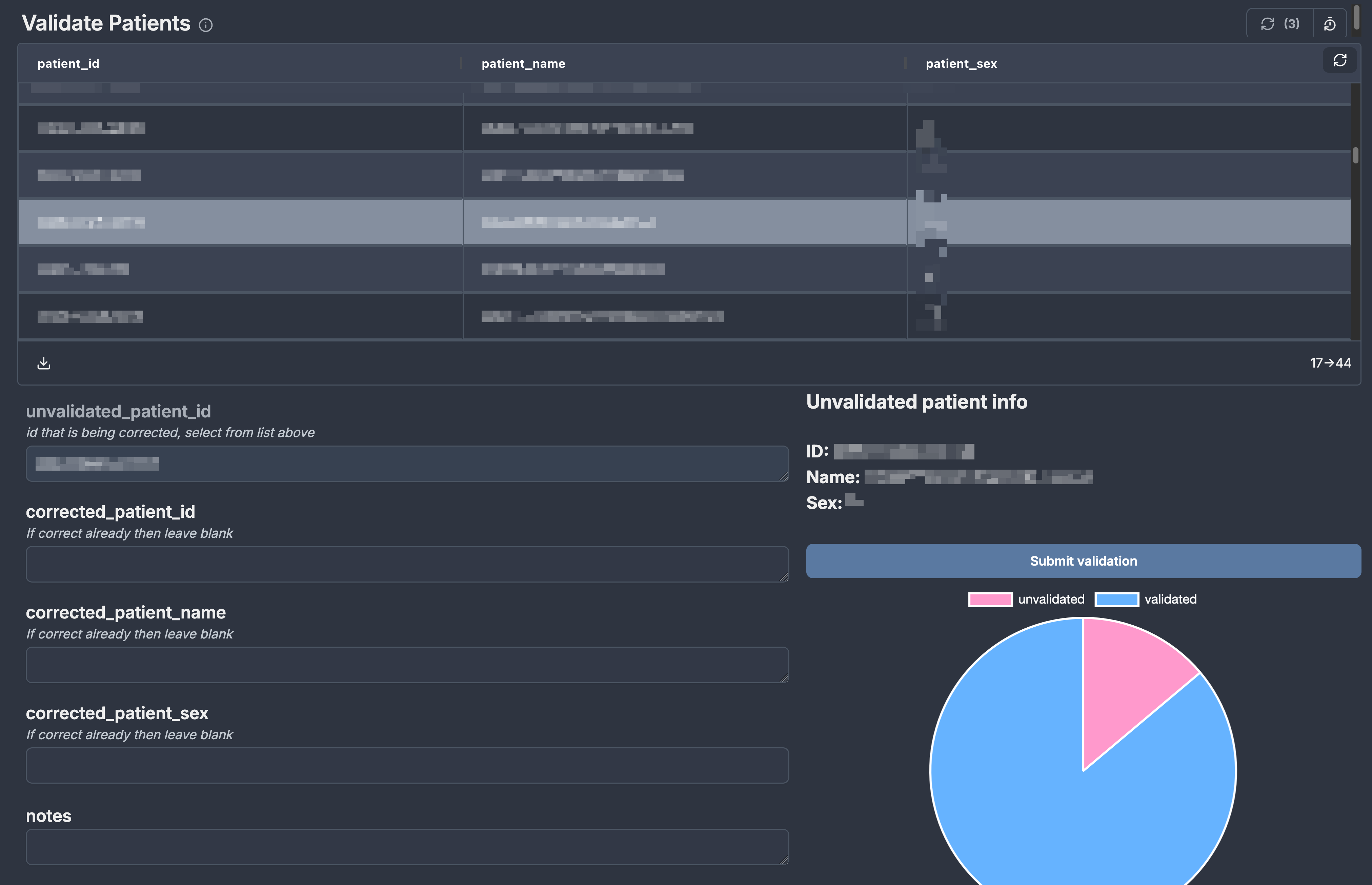Automated scripts check the expected patient IDs against the IDs manually entered by hospital technicians to ensure there are no errors. If typos or misspellings occur, we created a mechanism where a second person could validate the entered data and submit any corrections without altering the source data. For this purpose we experimented with windmill to create a simple web app that queries all the unvalidated patients and allows anyone to submit a correction.